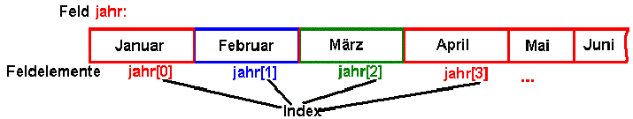 Das Feld jahr besteht aus den 12 Feldelementen jahr[0], jahr[1], ... jahr[10], jahr[11].