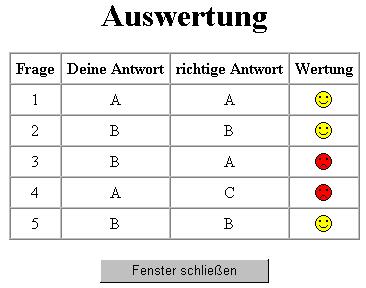 Beim Klick auf den Button Auswertung soll eine Funktion wertung() aufgerufen werden, die in einem Meldungsfenster ausgibt, wie viel Antworten richtig sind. |