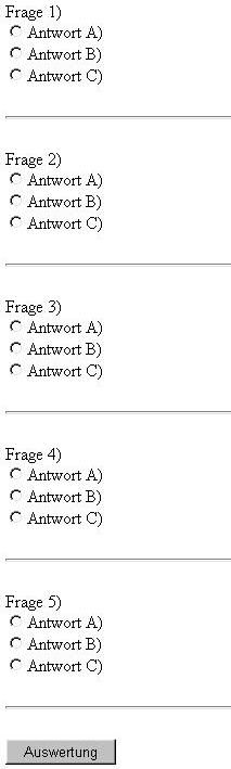 Das Formular soll 5 Fragen mit jeweils 3 möglichen Antworten sowie einen Button mit der Beschriftung "Auswertung" enthalten. Erstelle dazu das entspechende HTML-Dokument! |