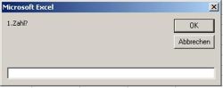 Eingabe und Speicherung![]() | Variable = InputBox("Text") | Z1 = InputBox("1. Zahl?") |